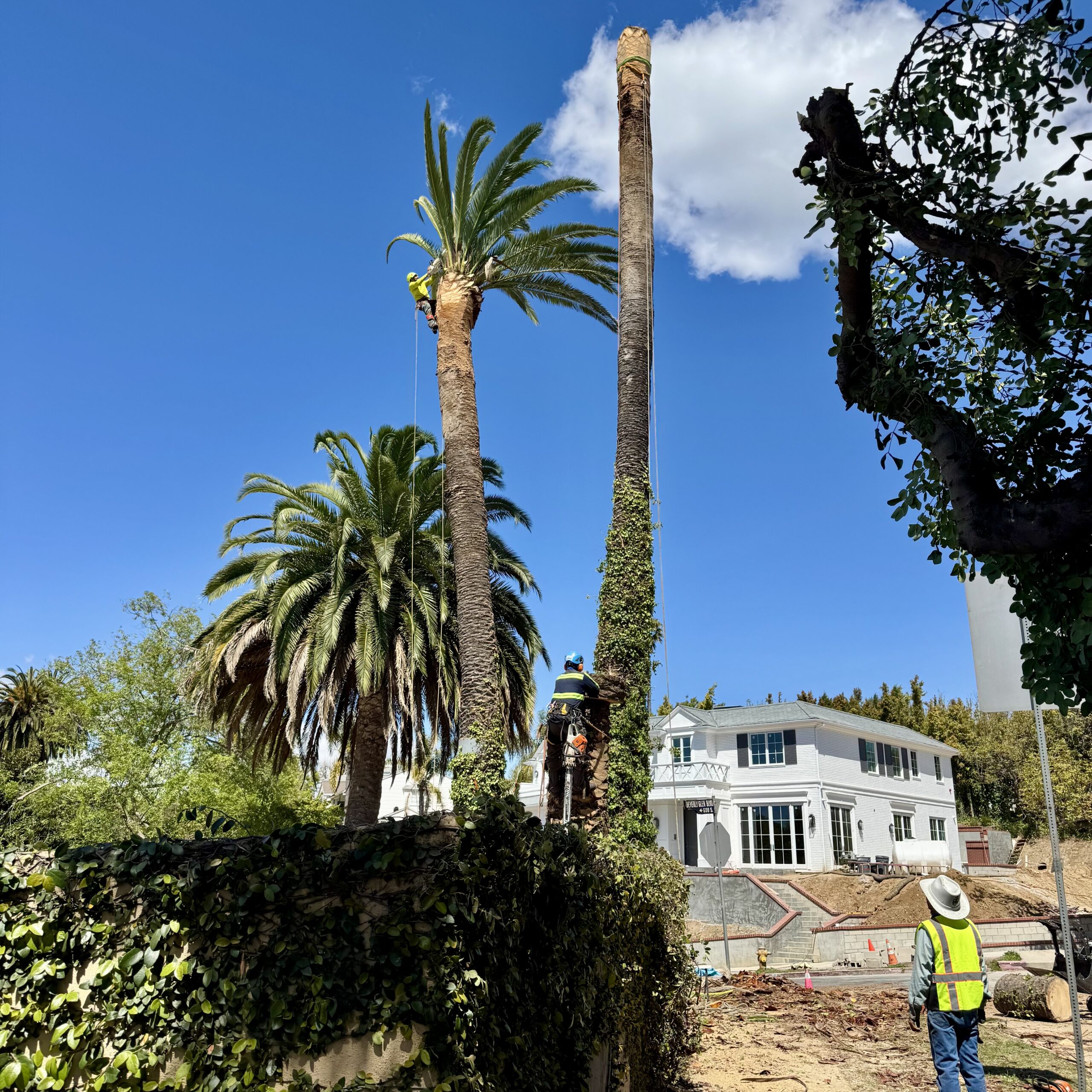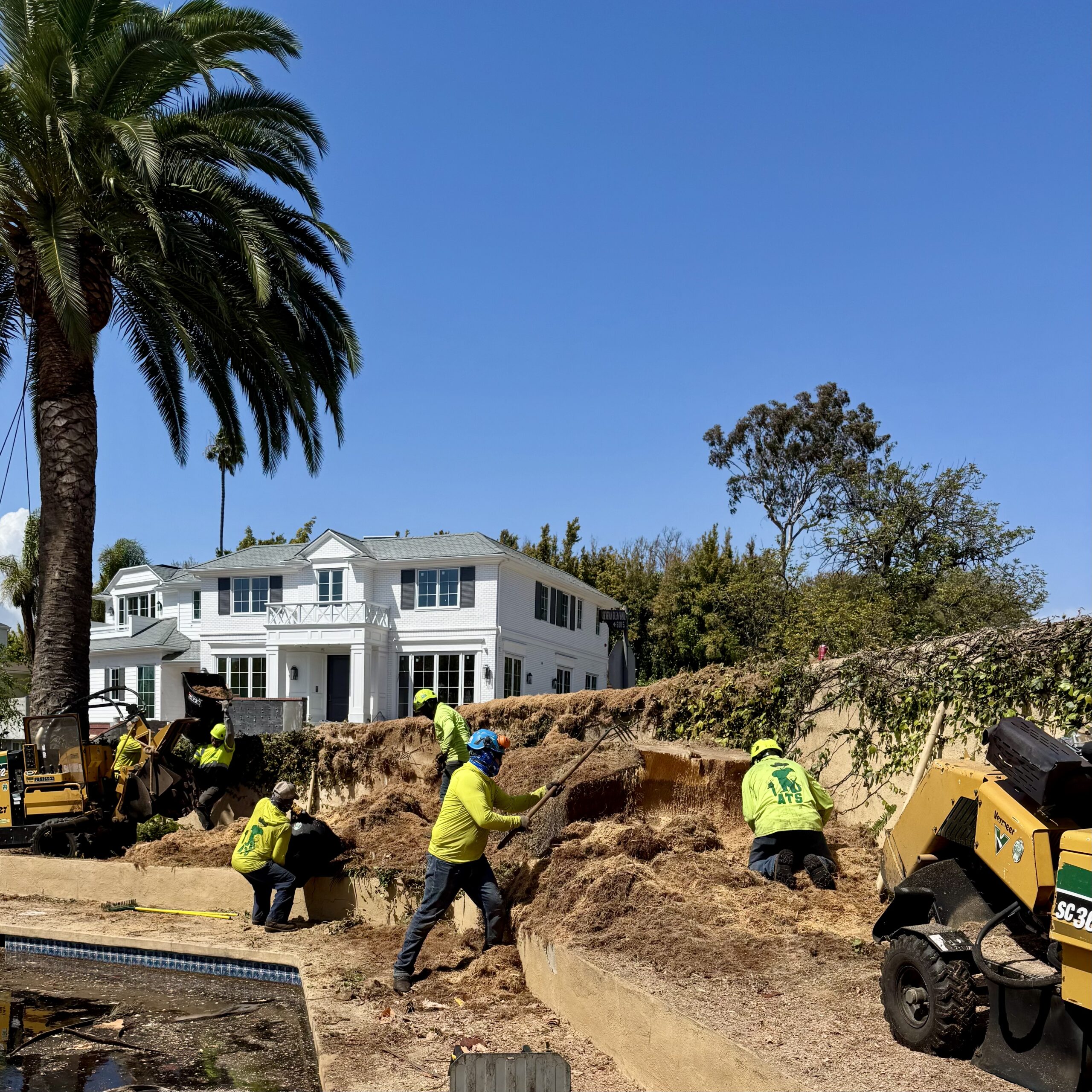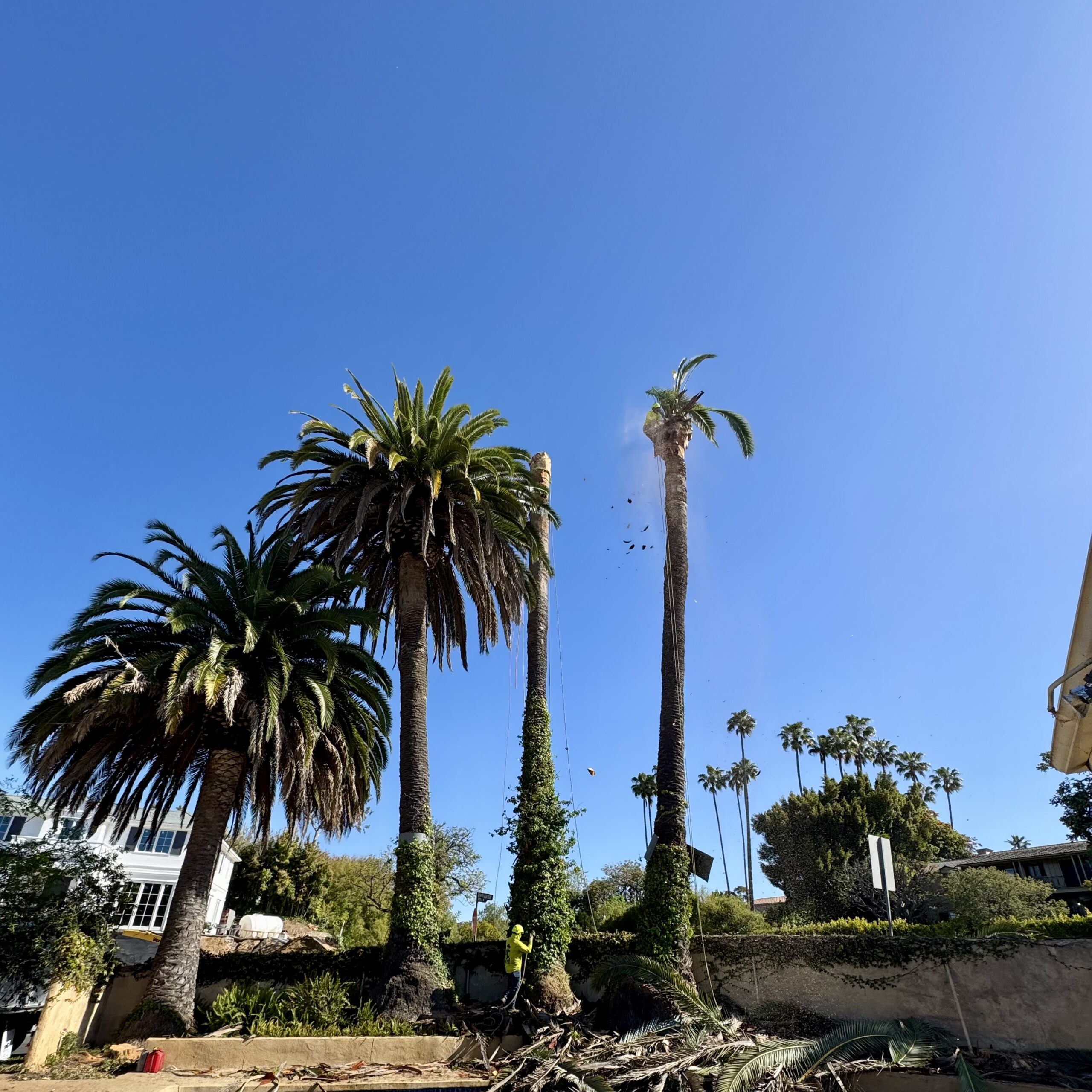 This residential project involved the removal of several mature date palms to allow for a home remodel. Each palm was carefully removed in sections, protecting the pool, surrounding walls, and property, followed by complete stump grinding to fully clear and prepare the area for construction.